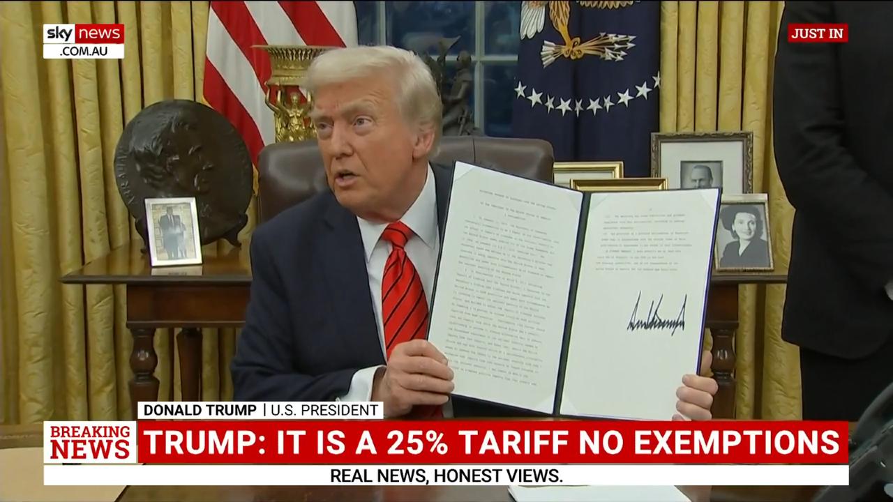 當地時間2月10日,特朗普籤令對所有美國進口鋼鋁產品徵收25%關税 澳大利亞天空新聞報道截圖