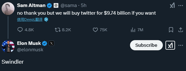 OpenAI首席執行官(CEO)薩姆·奧爾特曼隨即在社交媒體平台X上拒絕了這一提議。他寫道:“不,謝謝你,但如果你願意,我們將以97.4億美元的價格購買推特。”馬斯克在奧爾特曼的這條帖子下回了一個詞——“騙子”(Swindler)。