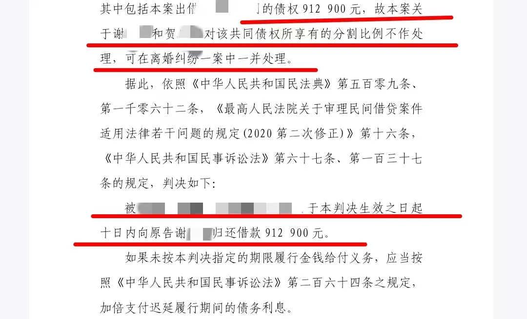 法院認為,賀某某轉出的款項系謝女士與賀某某夫妻共同共有財產,形成的債權應屬於夫妻共同債權,而如何分割將在她和賀某某的離婚糾紛案中一併處理。最終,法院一審判決被告賀某某母親公司向謝女士歸還借款91.29萬元。