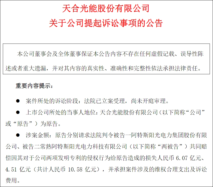 根據公告,天合光能請求法院判令被告一阿特斯,被告二常熟阿特斯陽光電力科技有限公司共同賠償因其對於公司兩項發明專利的侵權行為給公司(原告)造成的損失6.07億元、4.51億元,共計10.58億元,並承擔案件涉及的維權合理支出及訴訟費用。