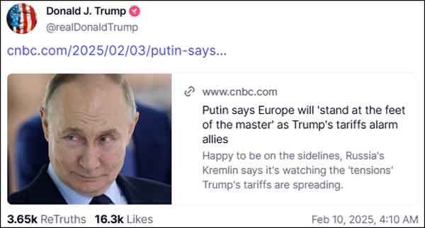 特朗普轉發普京發言:歐洲將站在美國主人腳邊,輕搖尾巴