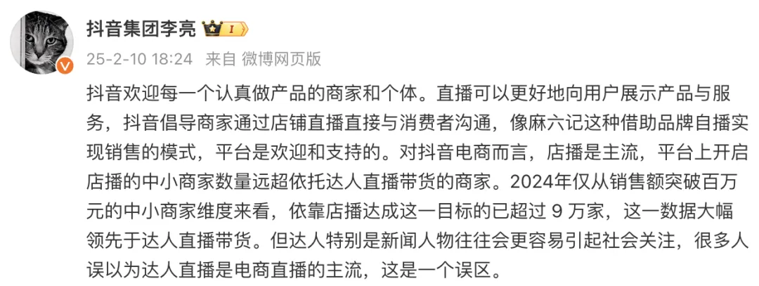 10日下午,抖音集團副總裁李亮發文回應“麻六記開播”,表示:抖音歡迎每一個認真做產品的商家和個體。直播可以更好地向用户展示產品與服務,抖音倡導商家通過店鋪直播直接與消費者溝通,像麻六記這種藉助品牌自播實現銷售的模式,平台是歡迎和支持的。