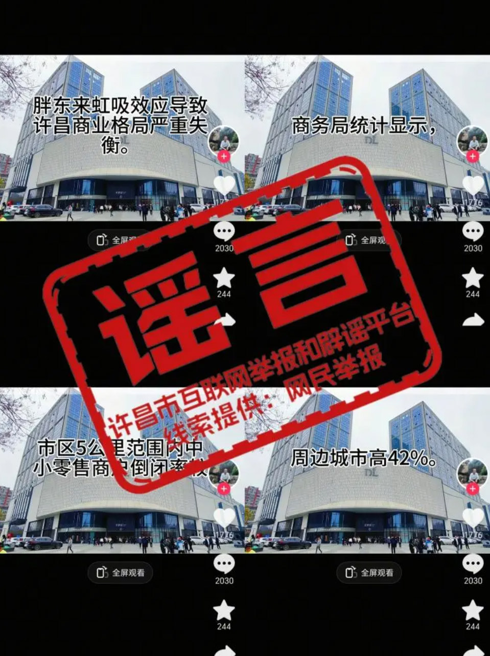 2月8日,微信公眾號“網信許昌”發佈消息,近日,許昌市委網信辦接羣眾舉報,多個短視頻賬號發佈信息稱,“胖東來虹吸效應導致許昌商業格局嚴重失衡。商務局統計顯示市區5公里範圍內中小零售商户倒閉率較周邊城市高42%。”經向市商務局核實,市商務局未統計發佈相關數據信息,網傳內容均為不實信息。