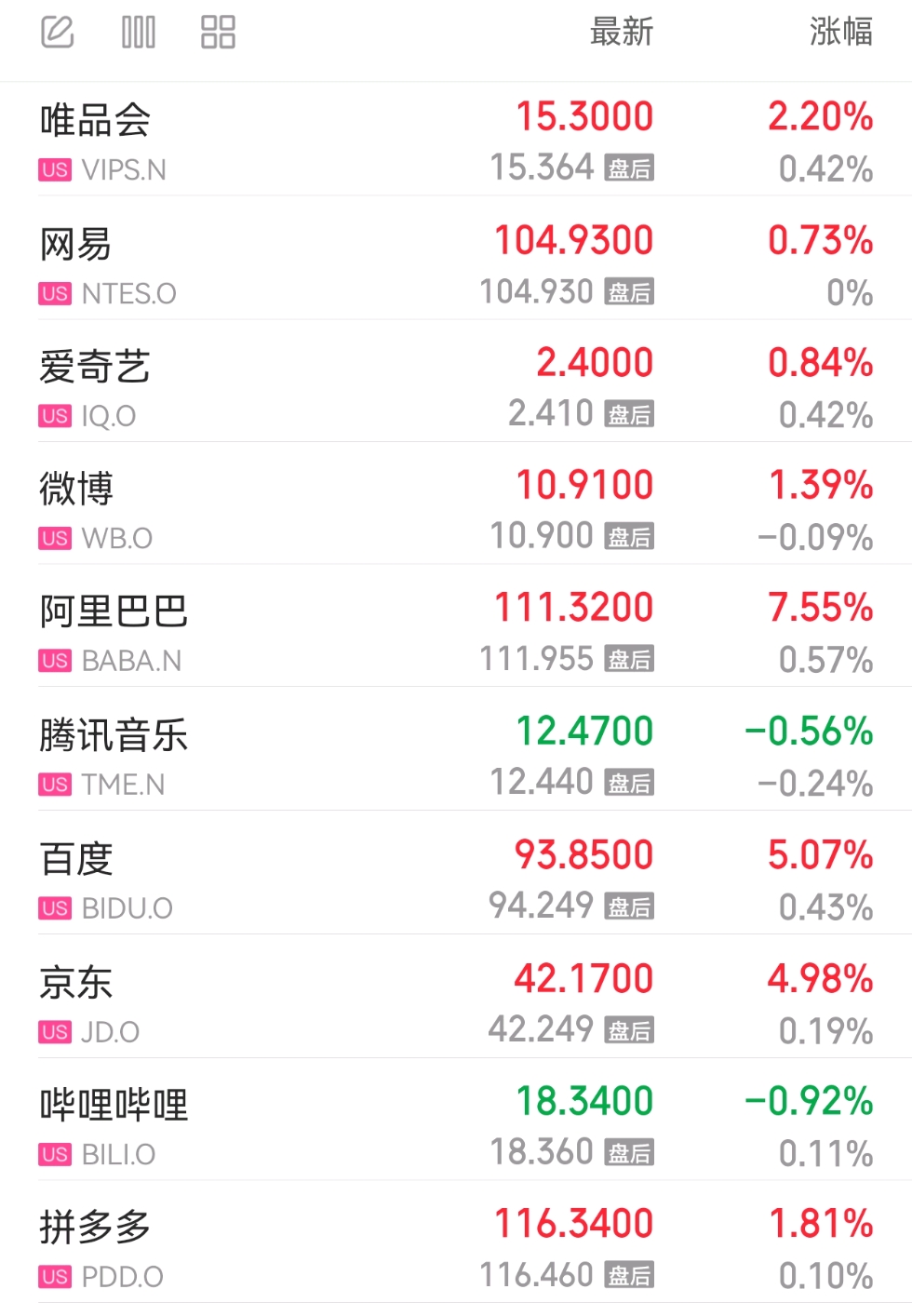 熱門中概股多數上漲,網易有道漲超40%,知乎、世紀互聯漲超15%,金山雲漲逾8%,阿里巴巴漲超7%,京東、百度漲幅也在5%左右。