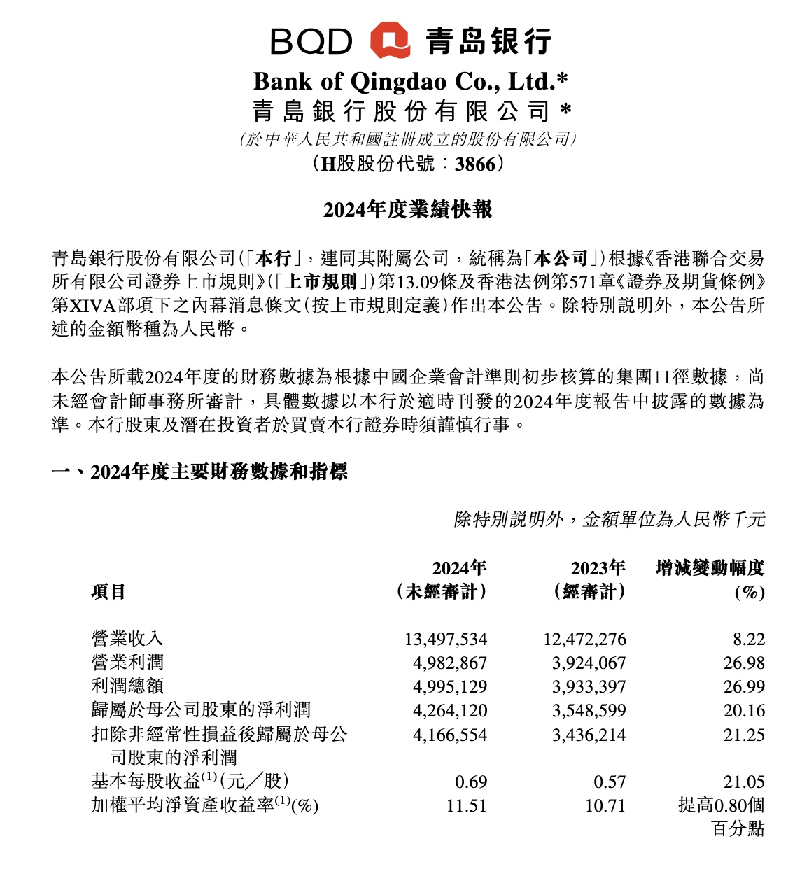 青島銀行業績快報:2024年淨利潤達42.64億元,同比增長20.16%