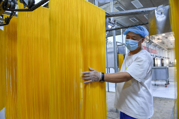 2024年1月25日,在吉林省公主嶺市的一家公司車間,工人查看玉米麪條生產情況。