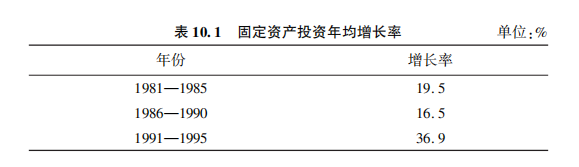 改革開放以後中國的投資增長一直比較快,尤其在1991年到1995年之間,固定資產投資的年均增長率從此前五年的年均16.5%一下子提高到了36.9%(見下表)。這種持續的投資過熱造成國民經濟的生產能力全面擴張,遠遠超過了消費的增長。因此中國在20世紀90年代中期走出短缺經濟的同時,即刻又陷入了生產能力普遍過剩和通貨緊縮的困境。