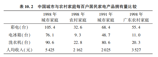 1998年農村的人均收入是2162元,比1991年的城市人均收入(2025元)略高一點,基本持平。與此同時,與1991年相比,1998年的家電產品價格明顯更低。例如,1991年一台25寸的彩色遙控電視機差不多要5000元,1998年差不多隻要1500元,是原來價格的不到三分之一。按理説,在收入水平相同、價格明顯下降的情況下,農村對家電的需求應該更大。然而,1998年農村的消費水平實際上遠遠低於1991年城市的消費水平。