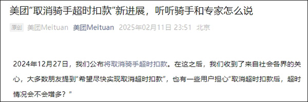 2024年12月27日,我們公佈將取消騎手超時扣款。在這之後,我們收到了來自社會各界的關心,大多數朋友提到“希望儘快實現取消超時扣款”,也有一些用户擔心“取消超時扣款後,超時情況會不會增多?”