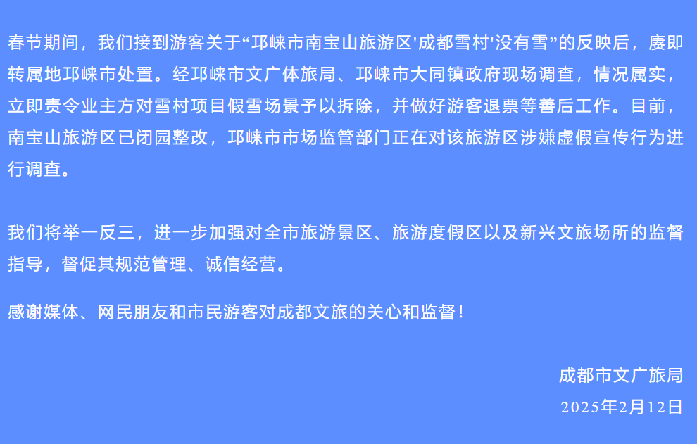 春節期間,該局接到遊客關於“邛崍市南寶山旅遊區’成都雪村’沒有雪”的反映後,賡即轉屬地邛崍市處置。經邛崍市文廣體旅局、邛崍市大同鎮政府現場調查,情況屬實,立即責令業主方對雪村項目假雪場景予以拆除,並做好遊客退票等善後工作。目前,南寶山旅遊區已閉園整改,邛崍市市場監管部門正在對該旅遊區涉嫌虛假宣傳行為進行調查。