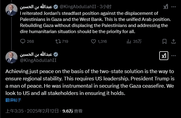 約旦國王重申,反對驅逐加沙居民 推文截圖