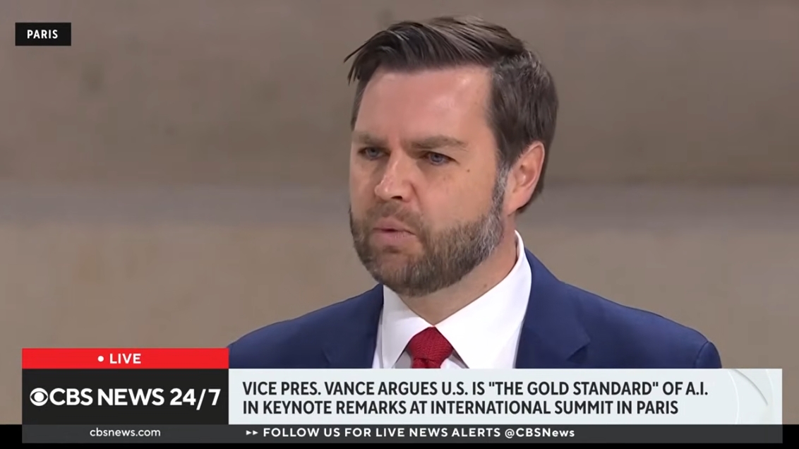 當地時間2月11日,萬斯在巴黎人工智能峯會演講。美媒視頻截圖