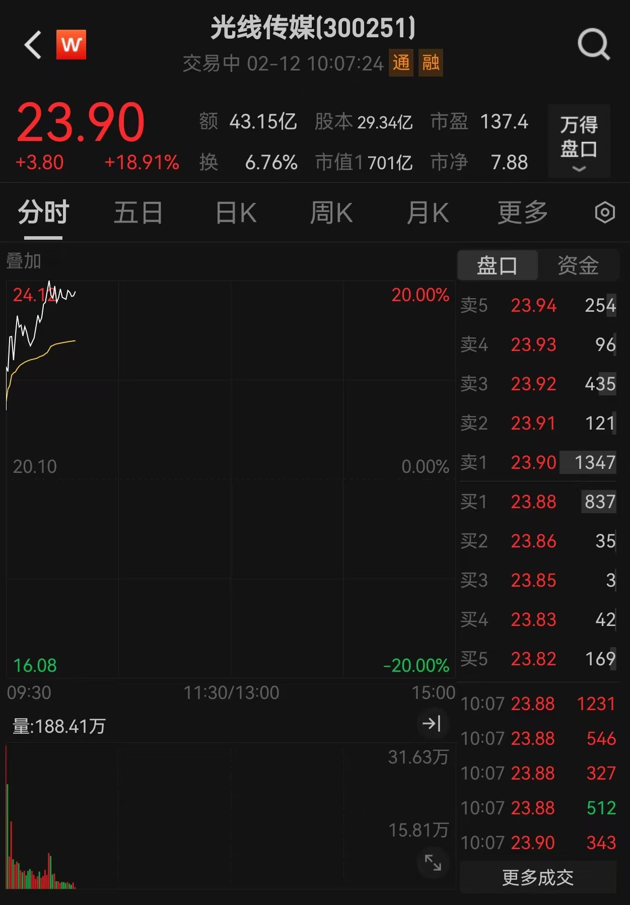 今日(2月12日)上午開盤,光線傳媒盤中觸及20CM漲停,成交額超36億元。消息面上,《哪吒2》票房突破90億元,進入全球影史票房榜前24名。