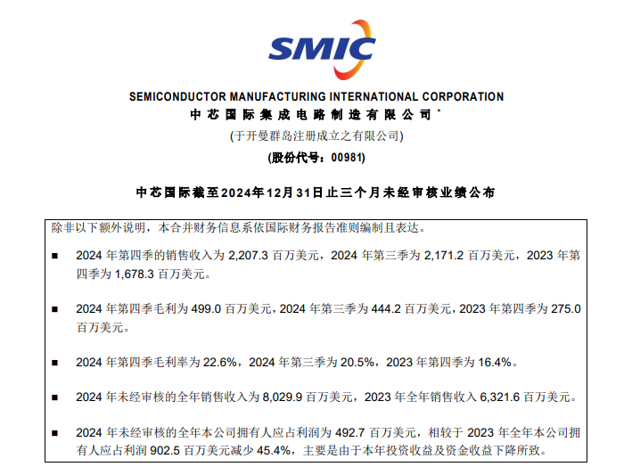 2月11日晚,中芯國際發佈2024年第四季度業績快報。資料顯示,2024年第四季度,中芯國際實現營業收入159.17億元,較上年同期增長31.0%;實現歸屬於上市公司股東的淨利潤9.92億元,同比下降13.5%。中芯國際2024年度未經審計的營業收入為577.96億元(80.3億美元),同比增加27.7%,首次突破80億美元。