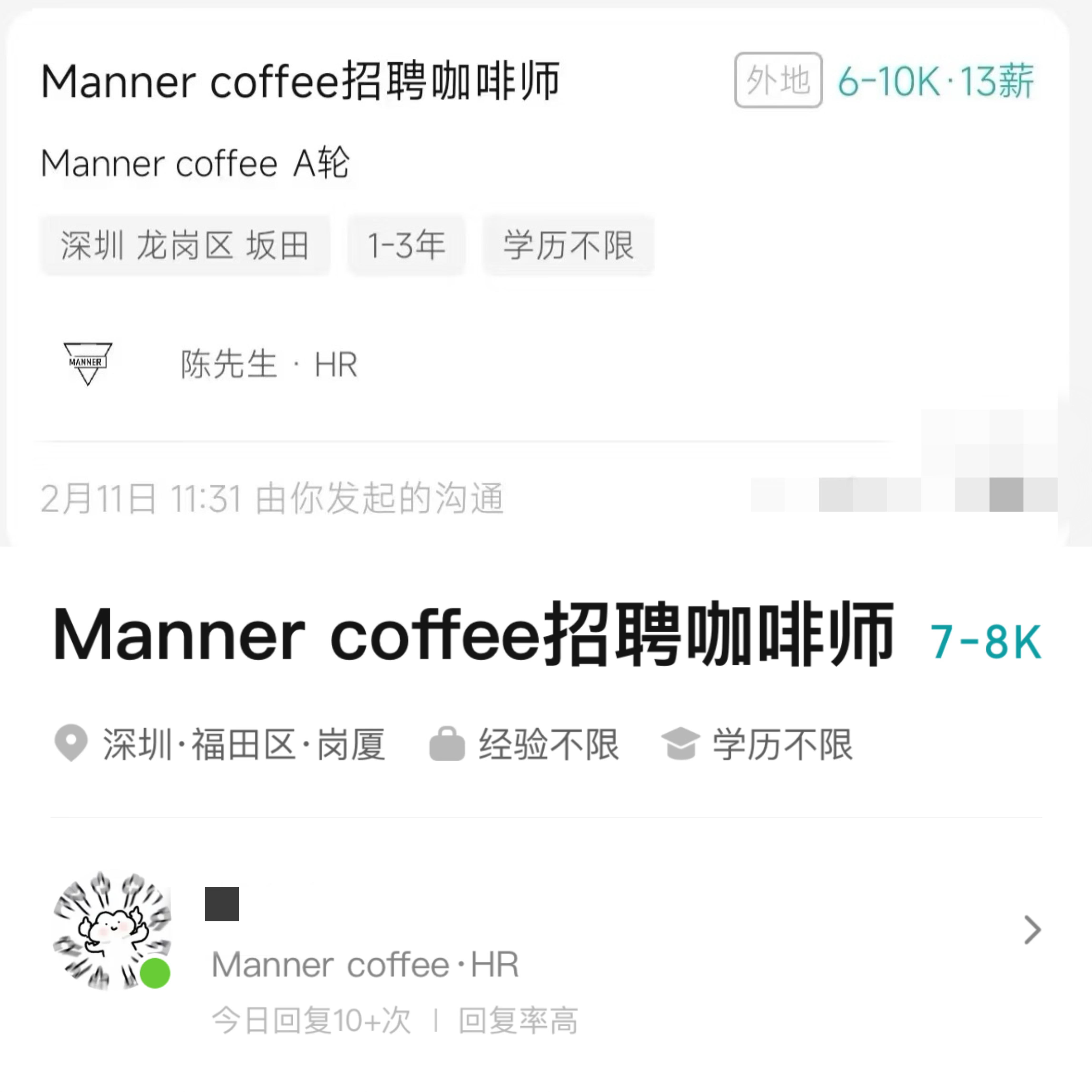 根據員工提供的招聘信息,MANNER(深圳)咖啡師給到的工資在6000-10000元/月,發放13薪。不過,Boss直聘上最新MANNER咖啡師招聘信息中,沒有寫明有13薪或年終獎,只提到了有加班補助、全勤獎、住宿補貼、餐補等員工福利。
