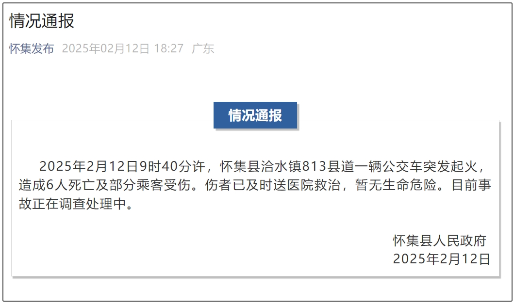 2025年2月12日9時40分許,懷集縣洽水鎮813縣道一輛公交車突發起火,造成6人死亡及部分乘客受傷。傷者已及時送醫院救治,暫無生命危險。目前事故正在調查處理中。