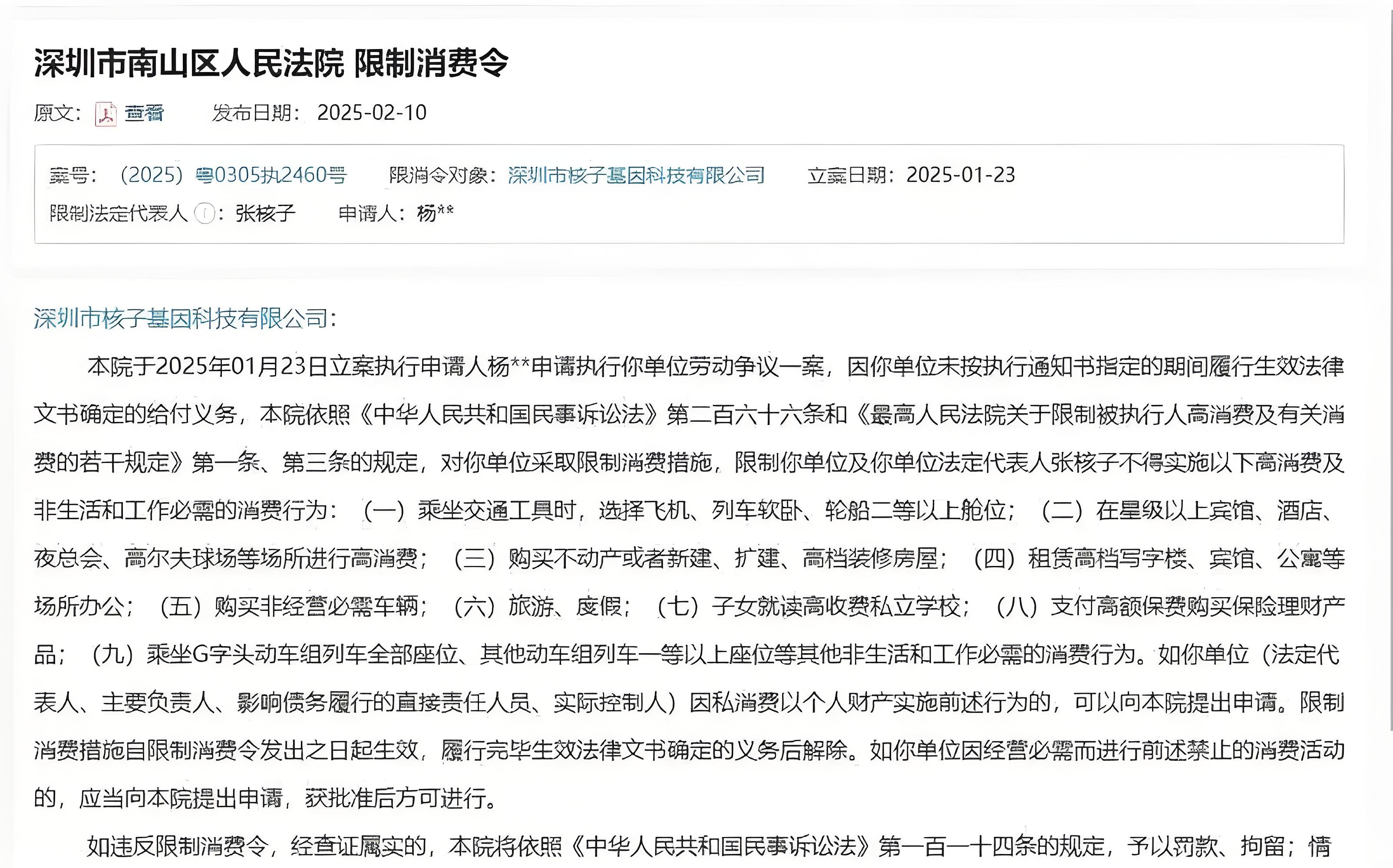 2 月 10 日,深圳市南山區人民法院發出的限制消費令,因未履行勞動爭議案,張核子及其公司被禁止高消費,包括乘坐飛機頭等艙、入住星級酒店等高消費行為。