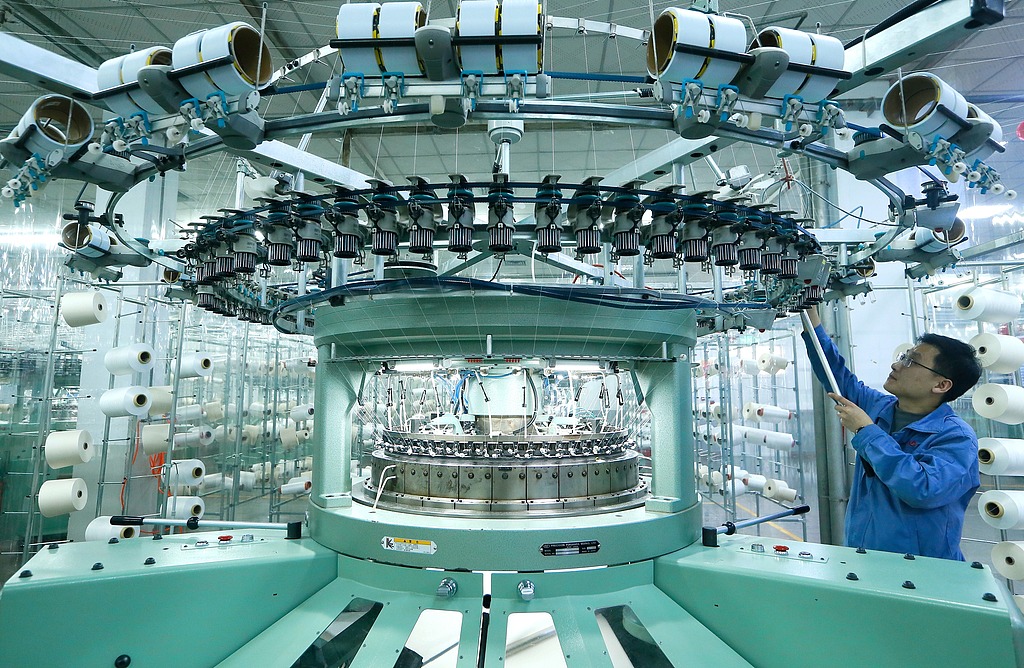 2月7日,青島市即墨區頤和針織有限公司的工人在生產出口到海外市場的服裝面料產品 視覺中國