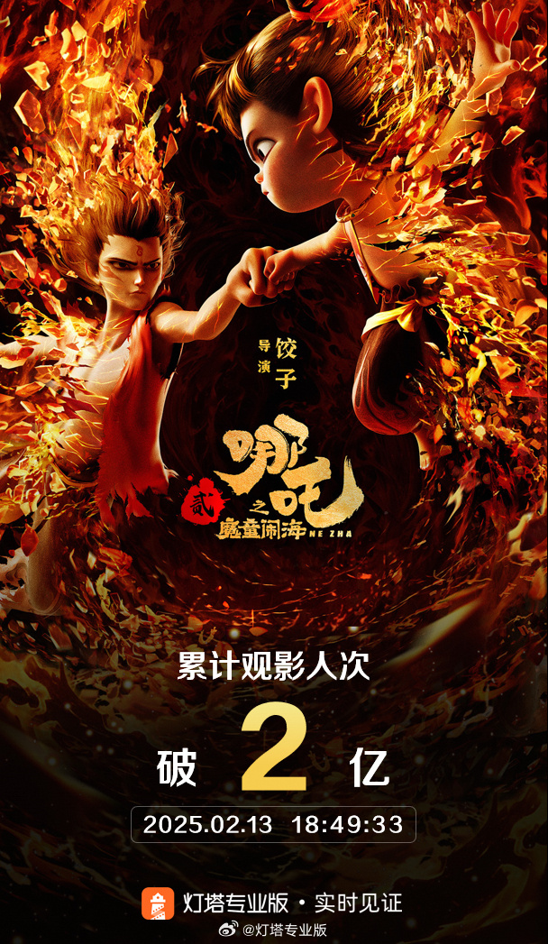 連日來,國產動畫電影《哪吒之魔童鬧海》一路高歌猛進、捷報頻傳。 自1月29日正式上映以來,《哪吒之魔童鬧海》已創造多項紀錄:2月6日超越《長津湖》票房成績,刷新中國影史最高票房紀錄;2月7日登頂全球影史單一市場票房榜,超過《星球大戰:原力覺醒》票房成績;2月13日觀影人次破2億,成為中國影史首部觀影人次破2億電影……