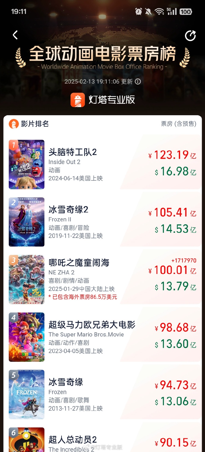 據貓眼專業版數據,電影《哪吒之魔童鬧海》全球票房(含預售及海外)突破100億,成為中國影史首部票房破100億電影以及亞洲首部百億票房影片,當前位列全球影史票房排名第17,全球動畫電影排名第3,並打破35項國內影史紀錄。