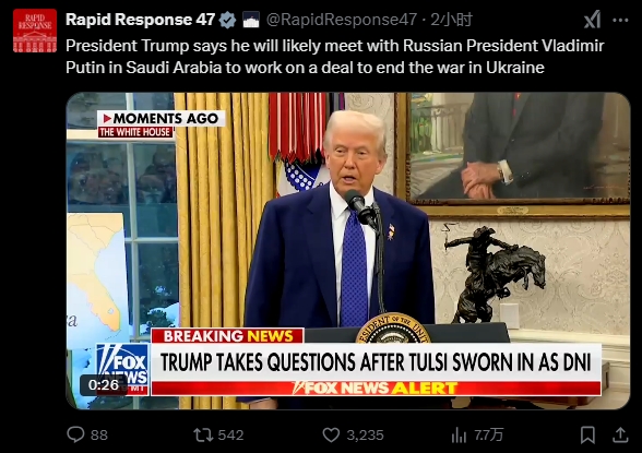 晚些時候,特朗普先後與普京、澤連斯基通話,隨後宣佈:立即開展俄烏和談進程、美俄同意深化合作並進行領導人互訪、美俄領導人將在沙特舉行會晤;