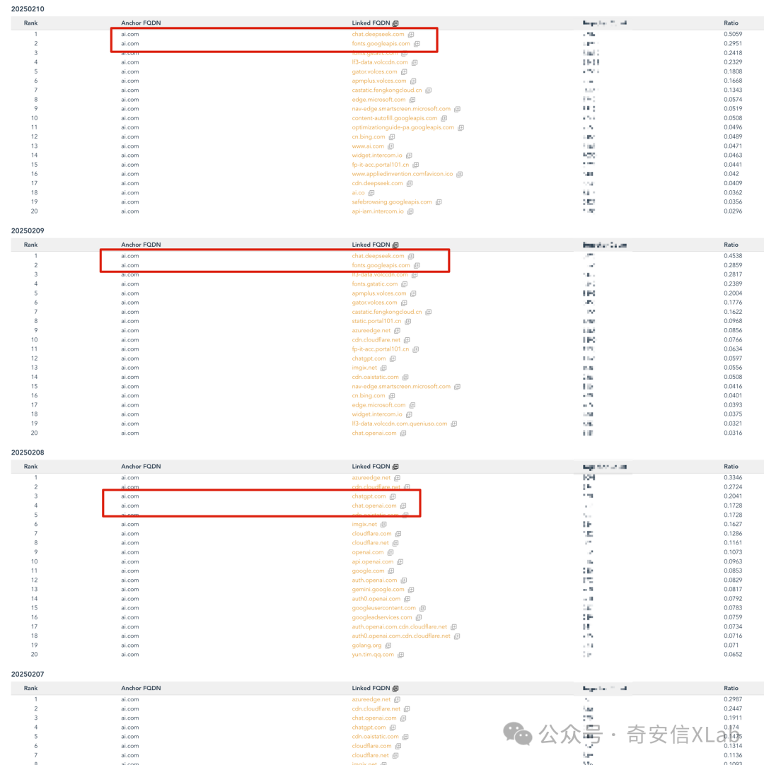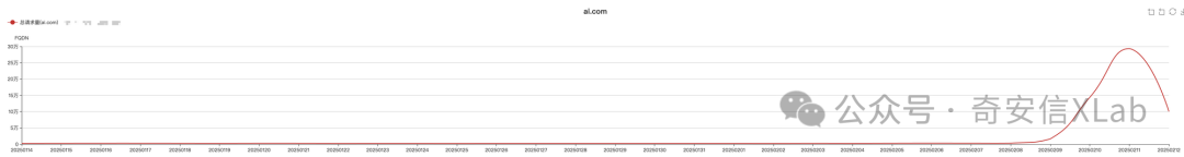 從我們PassiveDNS的數據來看,ai.com這個域名的訪問量從20250209開始已經快速上漲。後續的熱度還需要繼續觀察,我們希望它的上漲僅僅是因為媒體報道熱起來的而不是真實的有用户在例行使用。