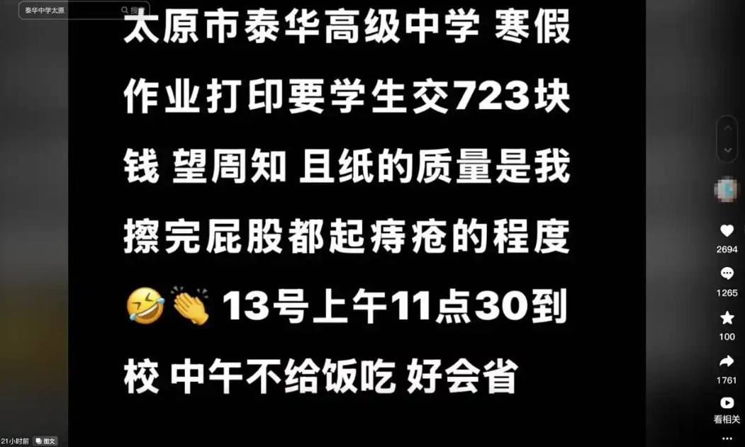 據奔流新聞此前報道,2月13日,一則“太原市泰華高級中學寒假作業打印要交723塊錢”的視頻,在社交平台上曝光後引發關注。
