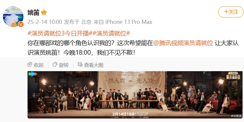 2月14日,姚笛再發文宣傳該節目:“你在哪部戲的哪個角色認識我的?這次希望能在《演員請就位》讓大家認識演員姚笛!今晚18:00,我們不見不散!”