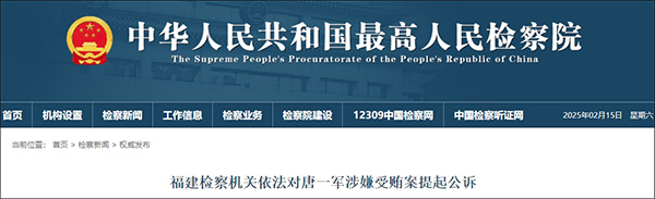 據最高人民檢察院網站2月15日消息,江西省政協原黨組書記、主席唐一軍涉嫌受賄一案,由國家監察委員會調查終結,經最高人民檢察院指定,由福建省廈門市人民檢察院審查起訴。近日,廈門市人民檢察院已向廈門市中級人民法院提起公訴。
