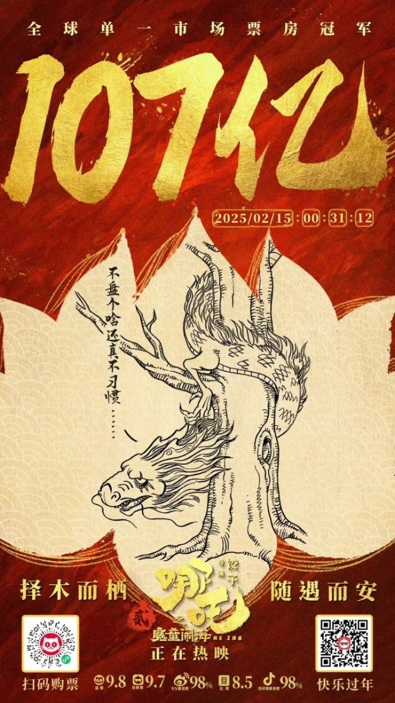 據此前報道,《哪吒之魔童鬧海》近日頻頻對各類電影紀錄發起衝擊。2月6日,《哪吒之魔童鬧海》登頂中國影史票房榜;2月13日19時許,《哪吒之魔童鬧海》的全球總票房(含預售)正式突破100億元大關,成為中國影史首部破百億的電影:2月15日,《哪吒之魔童鬧海》總票房(含預售)已超107.9億元,位列全球動畫電影票房榜第2位,全球影史票房榜第14位。
