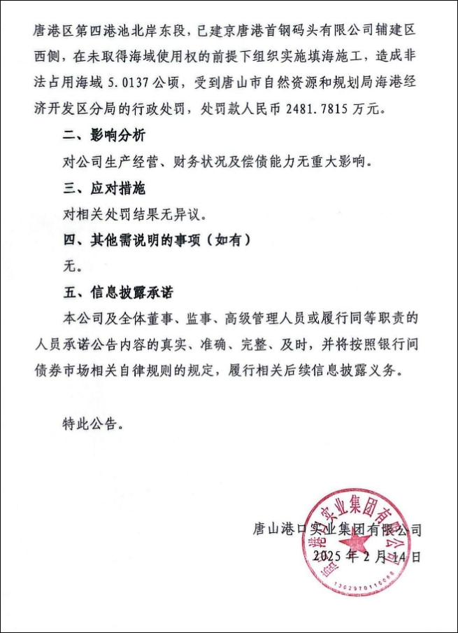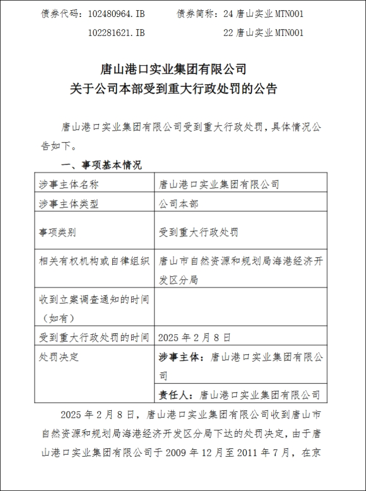 2月14日,唐山港口實業集團有限公司發佈關於公司本部受到重大行政處罰的公告。公告顯示,因在2009年12月至2011年7月期間,在未取得海域使用權的情況下組織實施填海施工,非法佔用海域5.0137公頃,公司於2025年2月8日收到唐山市自然資源和規劃局海港經濟開發區分局的處罰決定,罰款金額為人民幣2481.7815萬元。