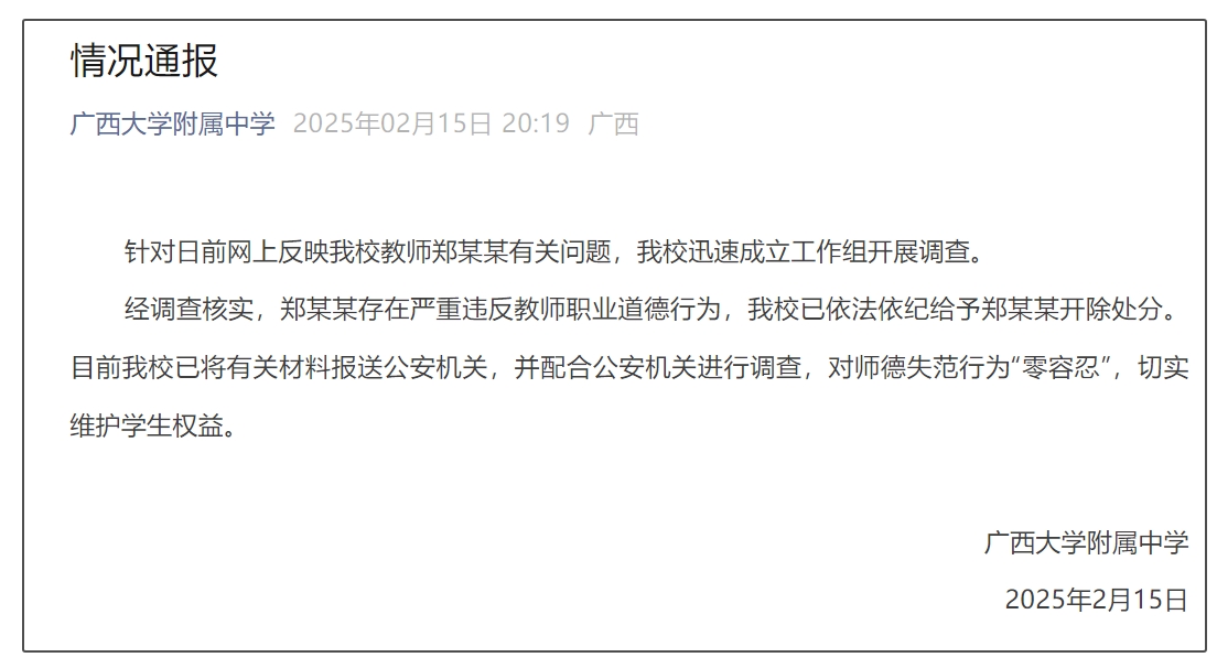 微信公眾號“廣西大學附屬中學”2月15日發佈情況通報: