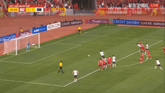 隨後吉爾吉斯斯坦憑藉一個轉換進攻扳平比分,門將出擊雙拳解圍中國隊任意球后,吉爾吉斯斯坦快速發動反擊,剛剛犯規吃到黃牌送出這個任意球的馬達米諾夫禁區線上左腳打出一記世界波遠射破門。上半場傷停補時階段,劉誠宇強吃對方中衞造點,王鈺棟操刀命中,中國隊2比1領先進入下半場。