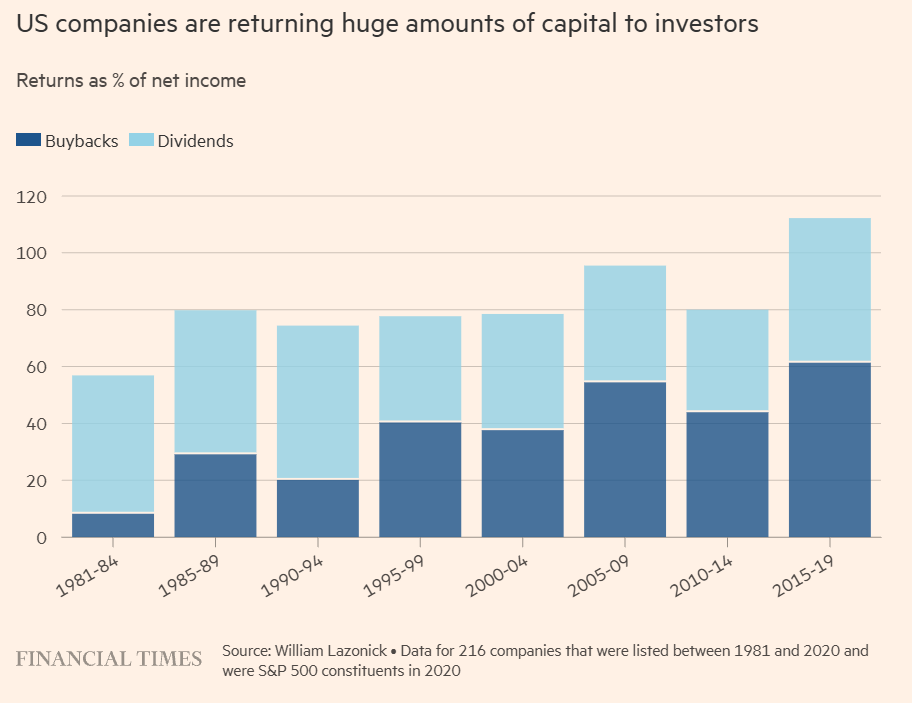 馬薩諸塞大學洛厄爾分校經濟學教授威廉·拉佐尼克(William Lazonick)對他眼中“縮減-分配”模式的出現感到遺憾,在這種模式下,公司以分紅和股票回購的方式將現金交給股東。與之形成鮮明對比的是第二次世界大戰結束後的20年裏,美國公司中盛行的“保留-再投資”策略。