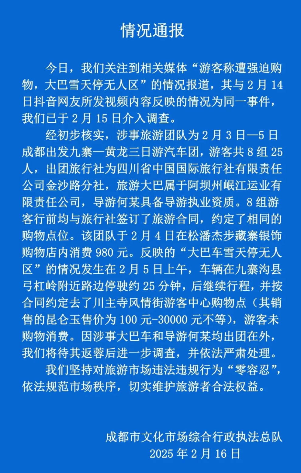 經初步核實,涉事旅遊團隊為2月3日—5日成都出發九寨--黃龍三日遊汽車團,遊客共8組25人,出團旅行社為四川省中國國際旅行社有限責任公司金沙路分社,旅遊大巴屬於阿壩州岷江運業有限責任公司,導遊何某具備導遊執業資質。8組遊客行前均與旅行社簽訂了旅遊合同,約定了相同的購物點位。該團隊於2月4日在松潘傑步藏寨銀飾購物店內消費980元。反映的“大巴車雪天停無人區”的情況發生在2月5日上午,車輛在九寨溝縣弓槓嶺附近路邊停駛約25分鐘,後繼續行程,並按合同約定去了川主寺風情街遊客中心購物點(其銷售的崑崙玉售價為100元-30000元不等),遊客未購物消費。因涉事大巴車和導遊何某均出團在外,我們將待其返蓉後進一步調查,並依法嚴肅處理。