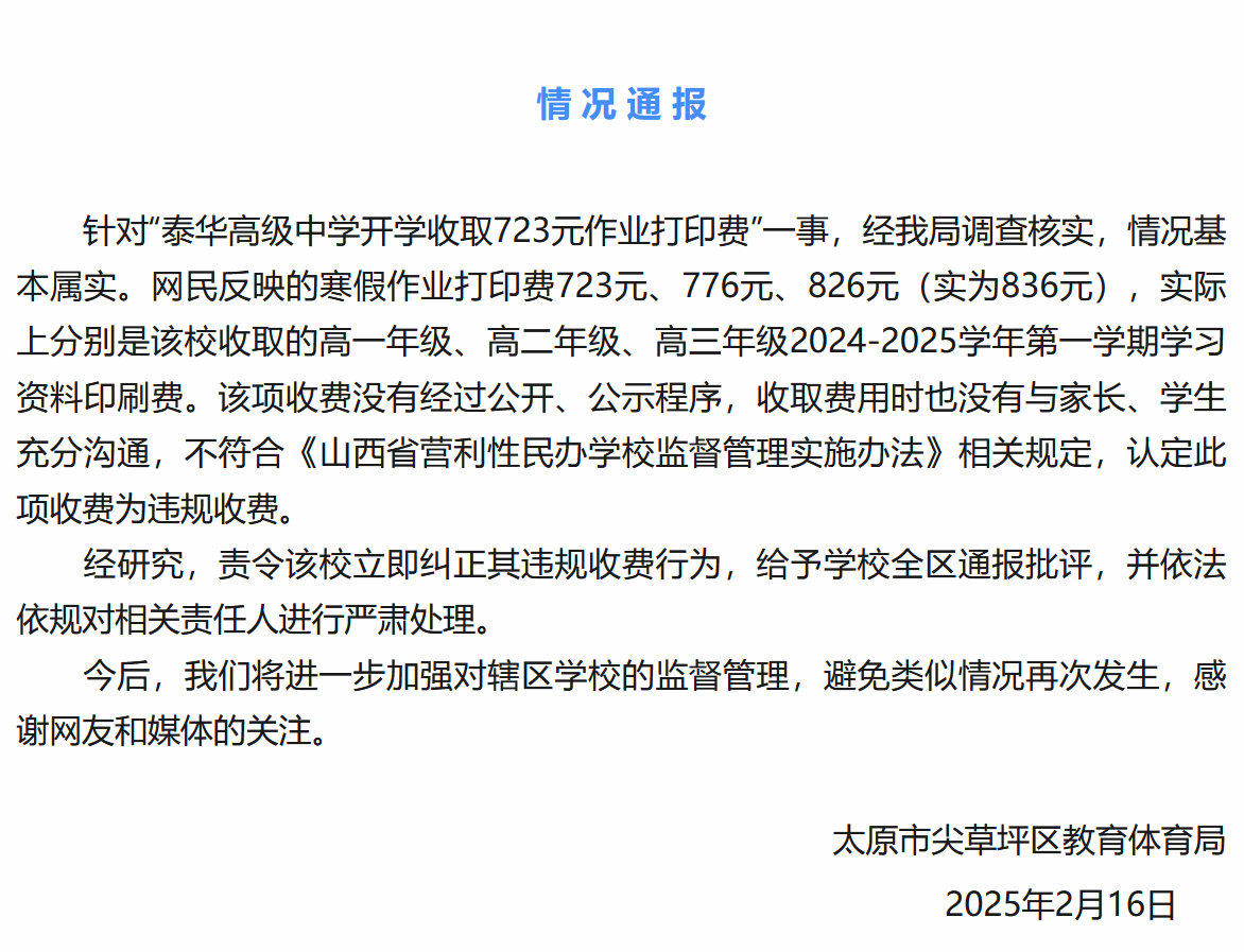 針對“泰華高級中學開學收取723元作業打印費”一事,經我局調查核實,情況基本屬實。網民反映的寒假作業打印費723元、776元、826元(實為836元),實際上分別是該校收取的高一年級、高二年級、高三年級2024-2025學年第一學期學習資料印刷費。該項收費沒有經過公開、公示程序,收取費用時也沒有與家長、學生充分溝通,不符合《山西省營利性民辦學校監督管理實施辦法》相關規定,認定此項收費為違規收費。