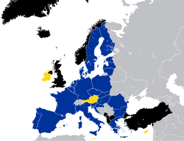 藍色為截至2024年3月同時擁有歐盟與北約成員身份的歐洲國家 維基百科