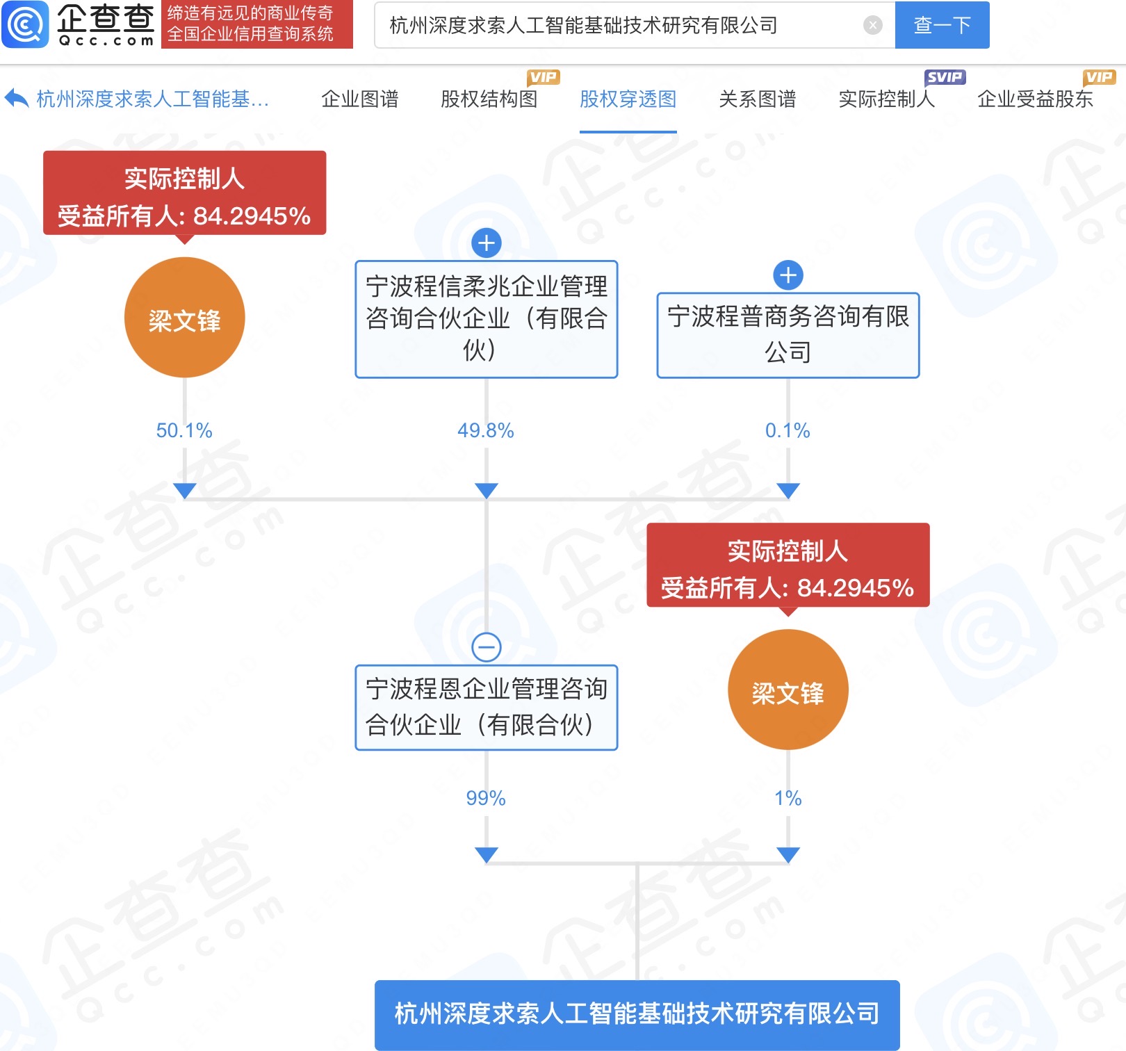 該公司成立於2023年,法定代表人為裴湉,含人工智能應用軟件開發等業務,由梁文鋒及其名下寧波程恩企業管理諮詢合夥企業(有限合夥)共同持股。