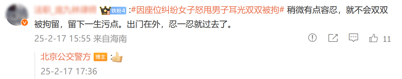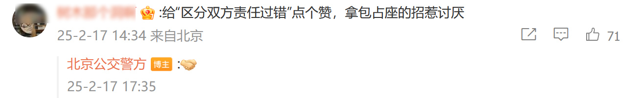 在上述消息評論區,有網友給“區分雙方責任過錯”點贊,並表示“拿包占座的招惹討厭”。@北京公交警方 對這條評論回覆了“握手”表情。