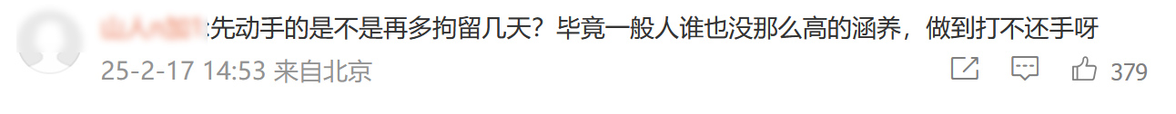 有網友提出,先動手的是不是再多拘留幾天?“畢竟一般人誰也沒那麼高的涵養,做到打不還手呀。”