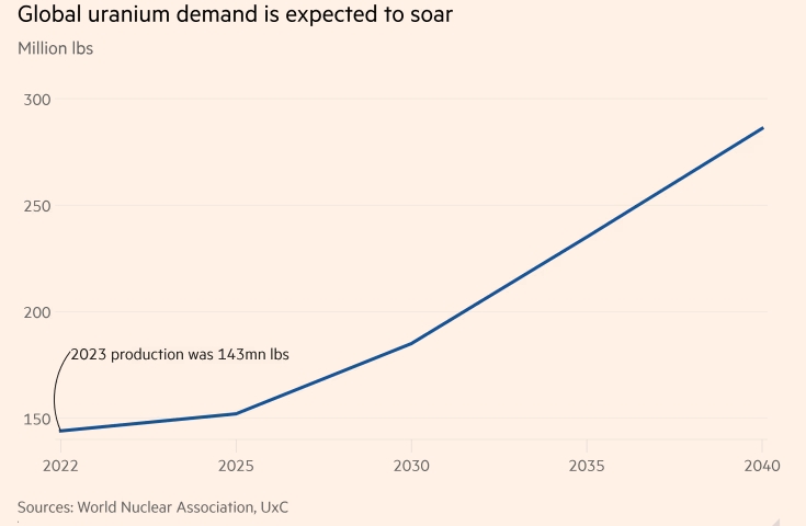 報道稱,隨着清潔能源日益受世界青睞,分析人士認為,對核能發電的需求將與日俱增。世界最大核能協會組織——世界核能協會(WNA)預計,到2040年,全球鈾需求將翻倍。包括美國、英國和韓國在內的許多國家已承諾,到2050年將全球核能發電能力提高兩倍。同時,科技集團也在為人工智能發展所需的數據中心尋覓能源。與哈薩克斯坦接壤的中國和俄羅斯,同樣在尋求大幅擴充國內核能。
