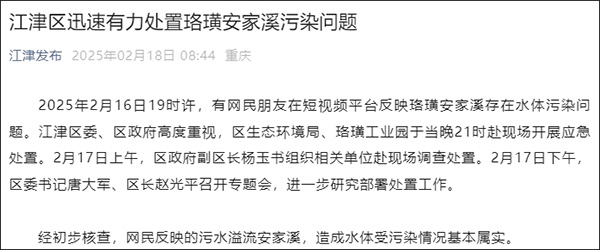 據重慶市江津區人民政府新聞辦公室微信公眾號“江津發布”2月18日消息,2月16日19時許,有網民朋友在短視頻平台反映珞璜安家溪存在水體污染問題。江津區委、區政府高度重視,區生態環境局、珞璜工業園於當晚21時赴現場開展應急處置。2月17日上午,區政府副區長楊玉書組織相關單位赴現場調查處置。2月17日下午,區委書記唐大軍、區長趙光平召開專題會,進一步研究部署處置工作。