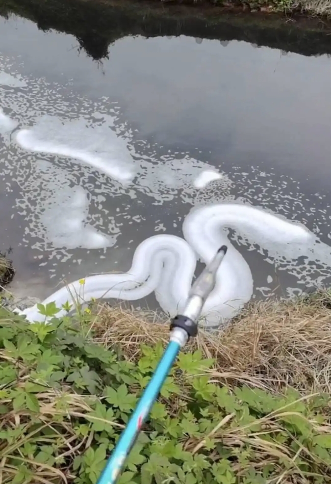 博主拍攝的排污口,水面漂浮着泡沫。封面新聞
