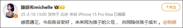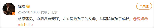 2月18日,陳曉、陳妍希官宣離婚,兩人發文稱,“感恩遇見,今後各自安好,未來同為孩子的父母,共同陪伴孩子成長”。