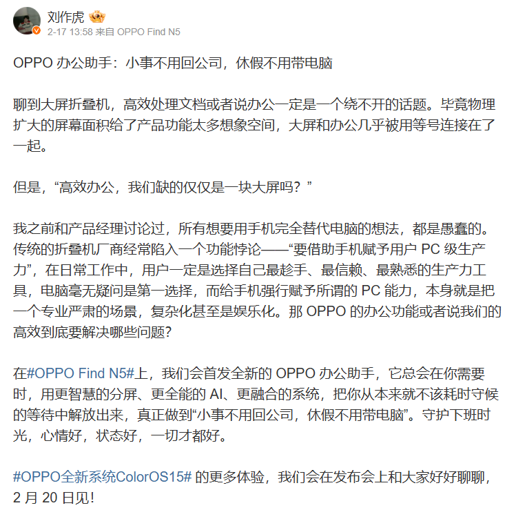 2月17日,OPPO首席產品官兼一加創始人劉作虎在微博發文稱,**所有想要用手機完全替代電腦的想法,都是愚蠢的。**在即將發佈的OPPO Find N5上,OPPO宣稱將首發全新OPPO辦公助手,“真正做到小事不用回公司,休假不用帶電腦”。