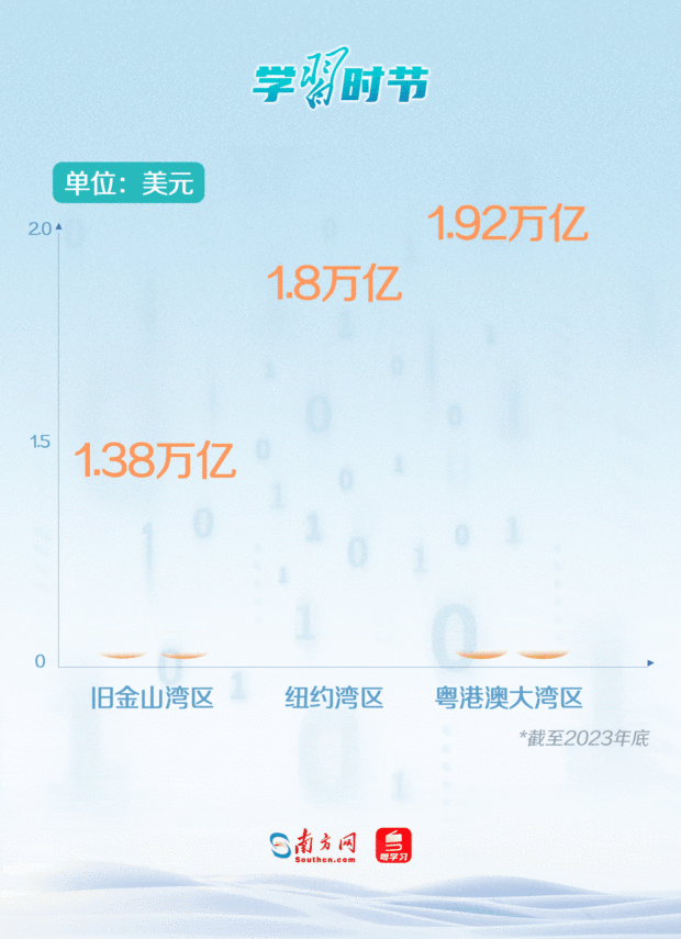 截至2023年底,大灣區經濟總量突破14萬億元人民幣(約合1.92萬億美元),成為中國經濟最具競爭力和最具活力的區域之一,入列全球灣區第一梯隊;