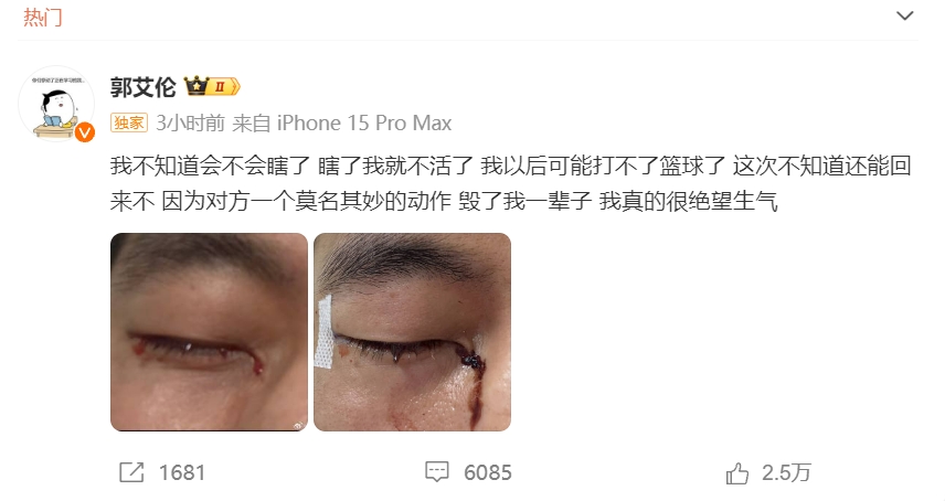郭艾倫訓練中眼睛被隊員戳傷致結膜破碎,縫了40多針,俱樂部:升級訓練安全管控體系
