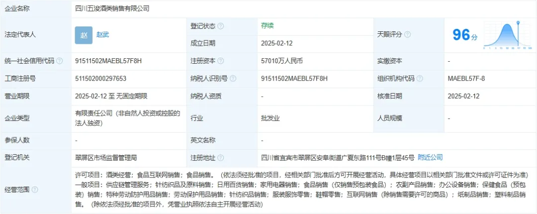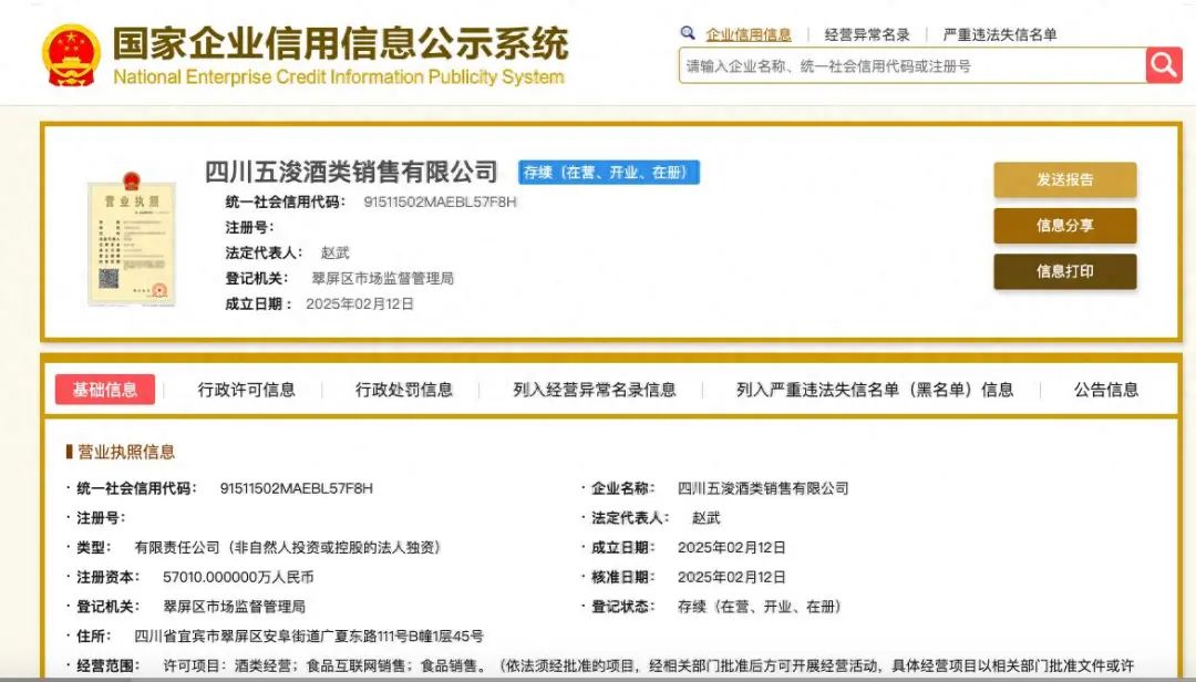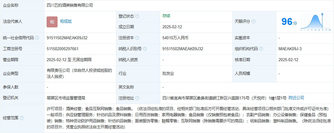 近日,國家企業信用信息公示系統顯示,四川五鈞酒類銷售有限公司(以下簡稱“四川五鈞”)、四川五浚酒類銷售有限公司(以下簡稱“四川五浚”)成立,註冊資本分別為5.4億元、5.7億元,登記地均在宜賓市翠屏區,經營範圍均為酒類經營等。