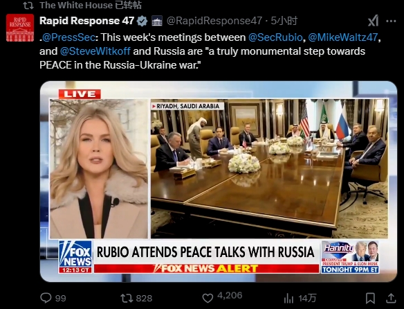 美國國務卿魯比奧則表示,美俄就四項原則達成了一致,包括涉及修復美俄外交關係、為結束俄烏衝突找到方案、思考美俄在衝突結束後的地緣政治和經濟合作以及確保這些過程以富有成效的方式推進。