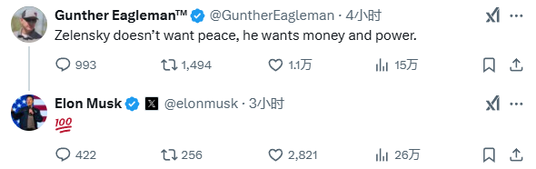 當日,知名“讓美國再次偉大”(MAGA)支持者、政治評論員岡瑟·伊格曼(Gunther Eagleman)在X平台發帖稱:“澤連斯基不想要和平,他想要的是金錢和權力。” 馬斯克很快在下方回覆了“100分”的表情,表明他對此表示認同。